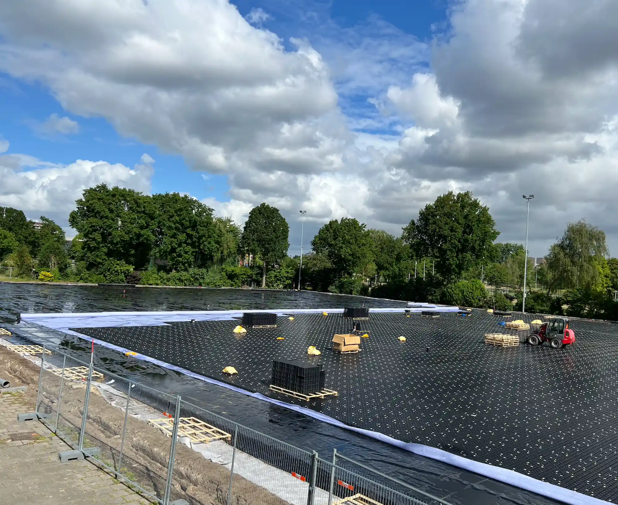 Overtollig regenwater loopt een ondergrondse tank, welke tevens is gemaakt van Permavoid units. Dit overtollige regenwater kan niet alleen gebruikt worden voor beregening van een aantal natuurgras speelvelden maar uit dit water wordt door het EnergyGrass systeem warmte onttrokken wat het naastgelegen clubgebouw van SV RAP voorziet van verwarming.
